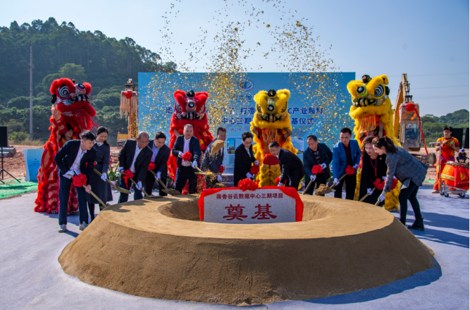 最后,在一片欢腾的礼炮声中,领导们同擎金锹,扬土培基,奠基仪式取得了圆满成功,南香谷云数据中心三期项目拉开了建设序幕。